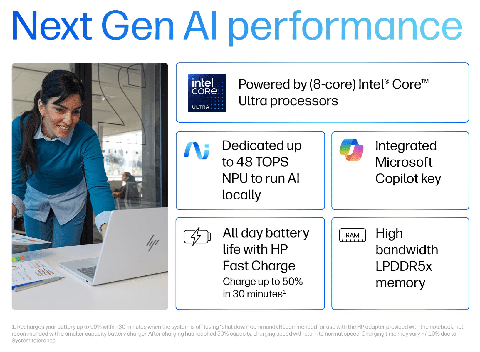 • AI Productivity: Intel AI capability helps accelerate meeting transcription, presentation work, and daily business workflows.