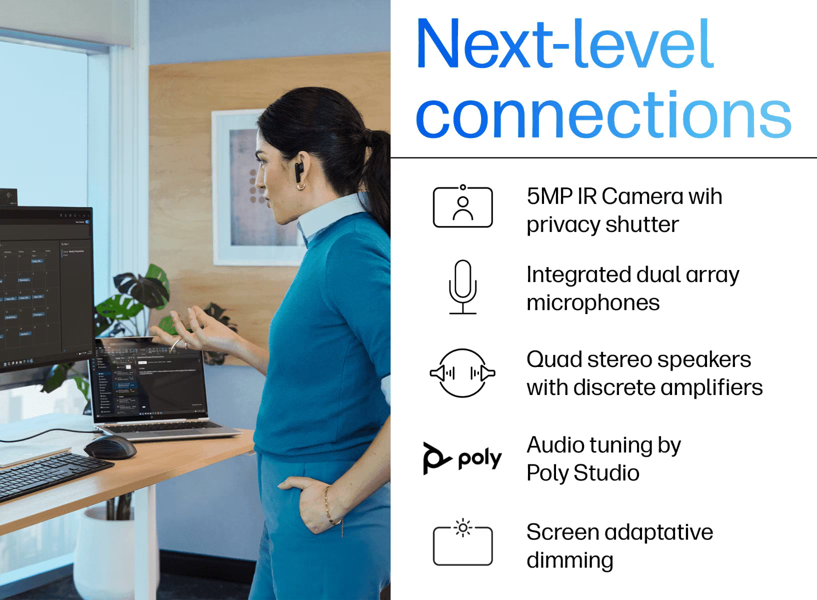 • Key Highlight 1: Built for advanced collaboration with Poly Camera Pro support, a 5 MP IR camera, and Poly Studio tuned audio.