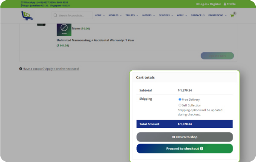 Alternatively, you may choose to pick up at our physical store located at Bugis Junction #03-25/26.